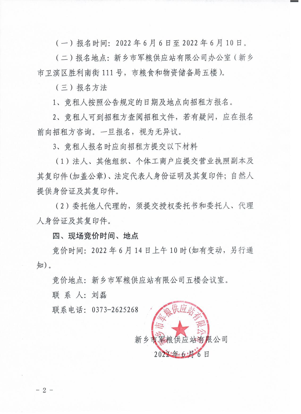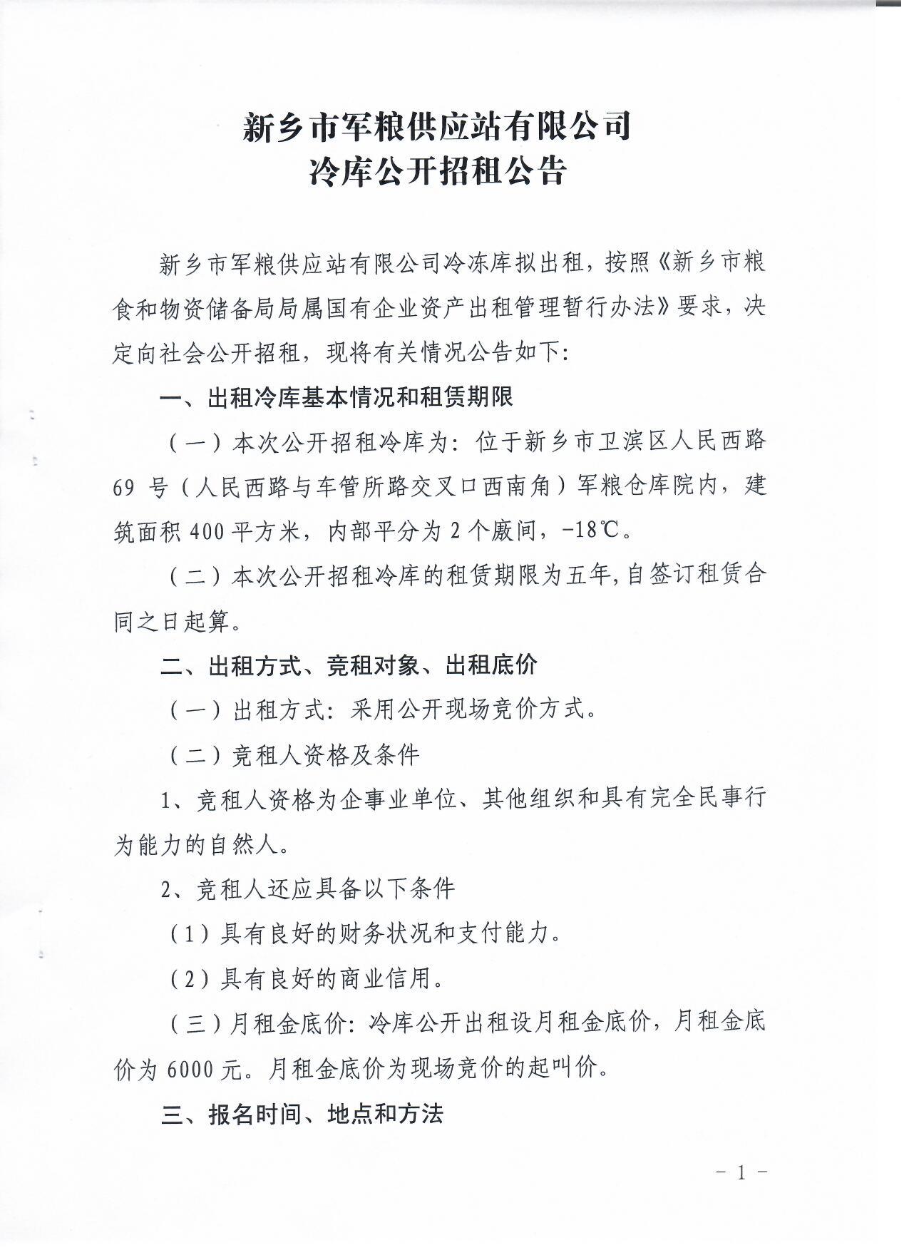 新乡市军粮供应站有限公司冷库公开招租公告