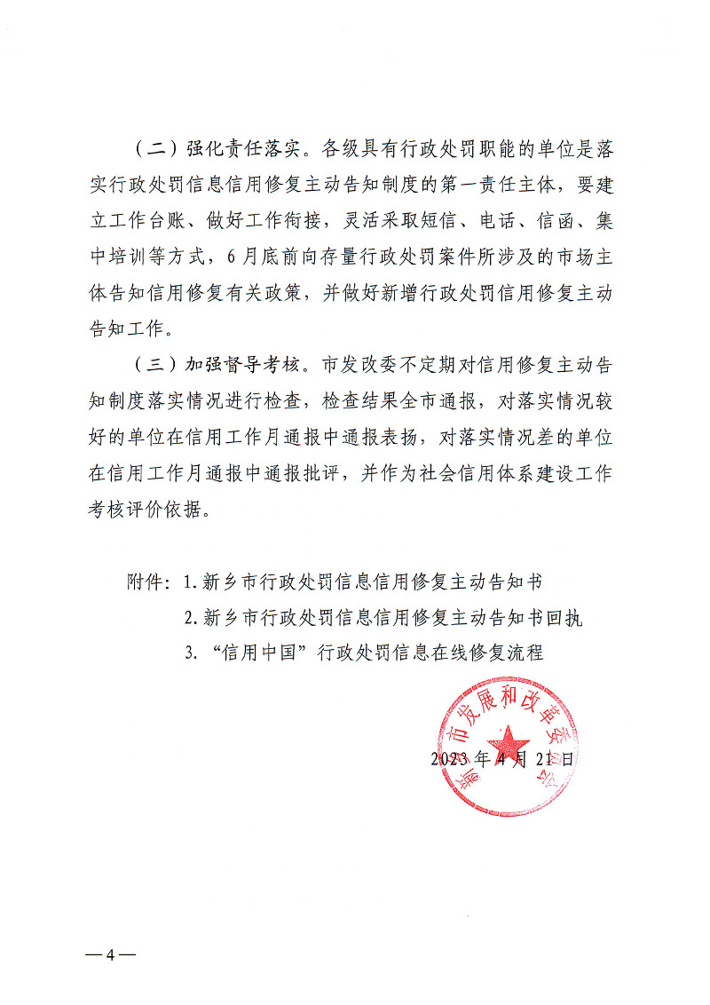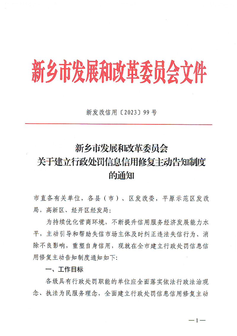 新乡市发改委关于建立行政处罚信息信用修复主动告知制度的通知