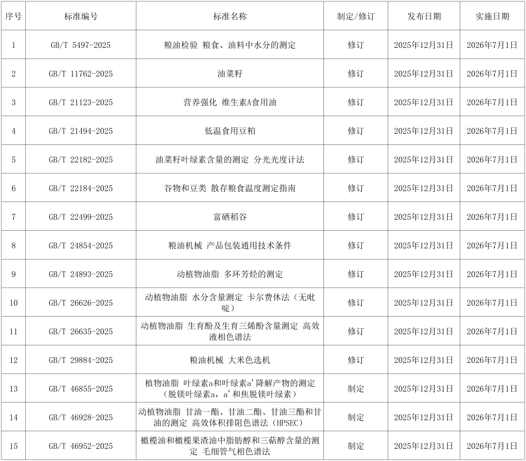 2025年12月31日,国家市场监督管理总局(国家标准化管理委员会)第38号公告批准发布了《粮油检验 粮食、油料中水分的测定》《油菜籽》等15项推荐性国家标准,自2026年7月1日起实施。